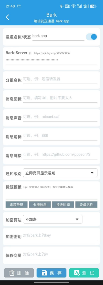 1.3.1 以bark为例,把bark里的url复制到短信转发器的bark-server中即可,右下角可测试