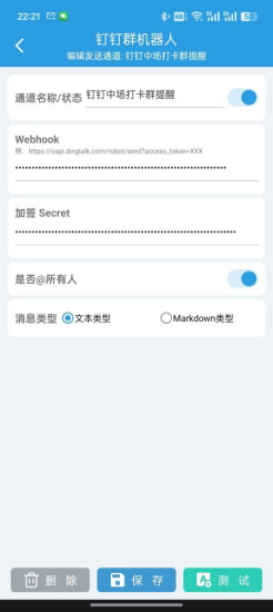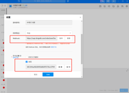 - 自定义机器人,安全设置->加签,复制到「加签Secret」一栏
