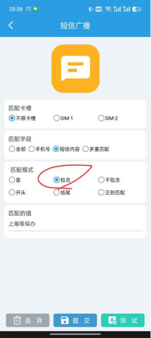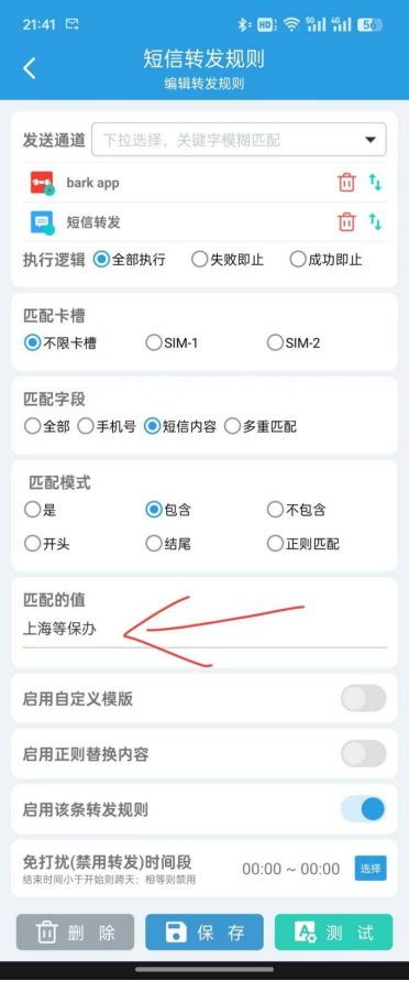 1.4 短信监听设置,设置短信内容关键字,发送通道选择钉钉、短信、bark,可多选