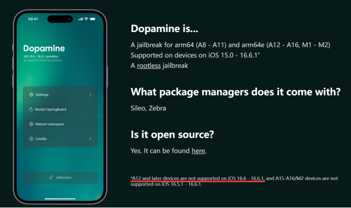 iPhone12(A14)iOS 16.6.1越狱多巴胺无法越狱的版本,可以用本文的方法试试 发表于 2025/09/29 作者 田原 1 分钟阅读想要给iphone越狱,发现手机A14的处理器,IOS版本16.6.1,多巴胺不支持。(如下图) 解决方法1.使用TrollInstallerX安装巨魔商店。(这步baidu可以搞定,安装巨魔商店时,网络比较重要,否则有可能失败,建议连手机热点) 2.使用巨魔商店安装NathanLR 3.NathanLR可以傻瓜式完成越狱 其他 iPhone 越狱 巨魔 NathanLR 本文版权归作者所有,未经许可不得转载。 分享