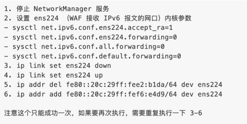 过NDP的时候有时候初始化网卡是红色不通过的,可以换成down掉网卡,在up网卡nmcli con down ens224 && nmcli con up ens224;watch -n1 “ifconfig ens224”,一定要网卡起来后才点击OK,同时关注下仪表发出的IPv6地址,根据这个地址选择正确的IPv6地址 地址缺失时需使用nmcli connection modify ens224 ipv6.addr-gen-mode eui64快速链接 - 开启或关闭路由转发